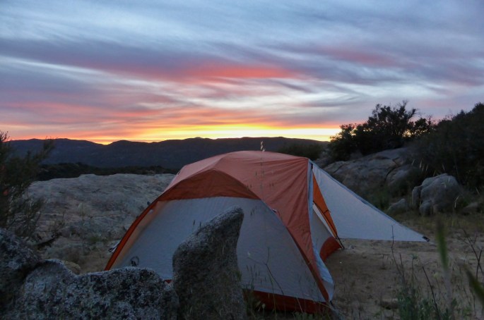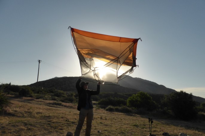 We have a rough idea in the morning where we’ll be spending the night, but ultimately we walk until about an hour before dark and then start sniffing around for a flat patch of ground to fire up the tent. This style of “outdoor living” is new for me and I must admit, pretty cool. We’re using a free standing dome tent which while a bit on the heavy side (compared to sleeping under a tarp) offers the ultimate in pitchability and can be put up almost anywhere. It’s also super easy to clean out the sand in the morning.
