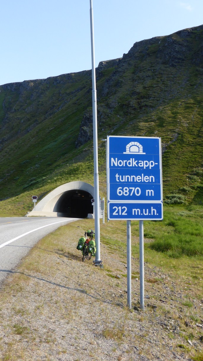 It’s also incredibly loud. The Nordkapp appears to be a magnet for every motorcycle rider on the continent, and they all pass through this tunnel. Harley Davidson’s are annoying enough in the open air, but put one in a concrete tube under the ocean and it sounds like the 4 horsemen of the apocalypse are galloping up behind you. The most insidious thing however about the BSTD, is the grade of the roadway. Like the drawing above, the road is laid out in a U shape, with hills on either end and only a brief flat spot in the middle. The hills are graded at about 10%. This is steep for a bicycle and means that for the last 3.5km, you’re grinding your way uphill, panting and sweating, like a fat man on a treadmill.