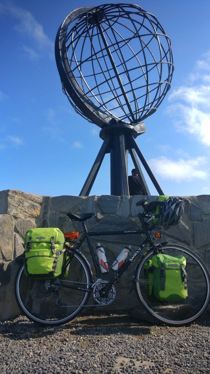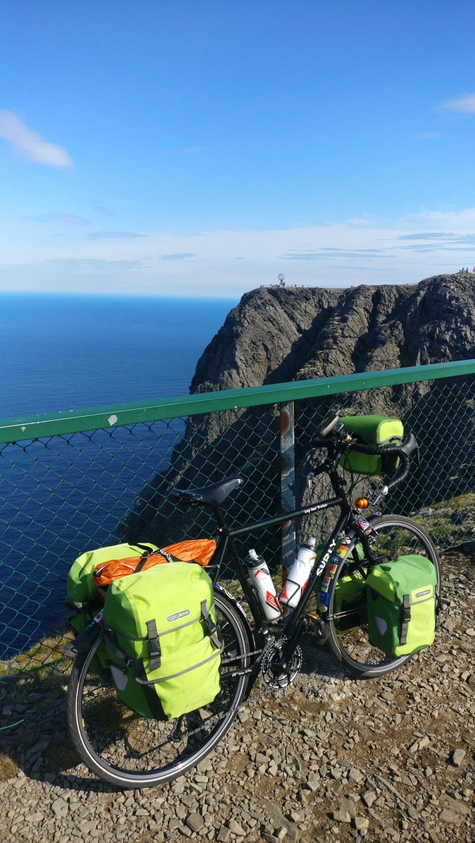 At 71 deg north, the Nordkapp is well inside the Arctic Circle. It was a 1000′ drop to the Arctic Ocean, so there wasn’t going to be any ceremonial “dipping of the bicycle wheels”. I’d never seen the Arctic Ocean before, and I was really lucky as this particular patch of real estate spends about 330 days a year shrouded in fog. I had a beautiful blue sky and light winds.