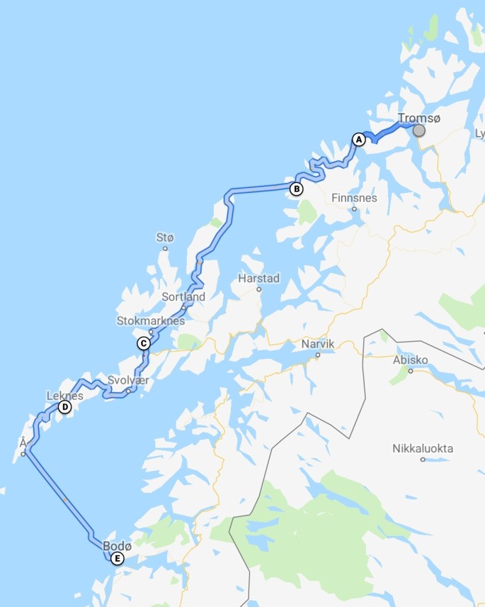 When we last spoke, I was on a day off in Tromsø. Since then, I really couldn’t tell you where I’ve been, simply because I can’t pronounce the names of the places. Fortunately, I can let Google Maps do the talking for me.